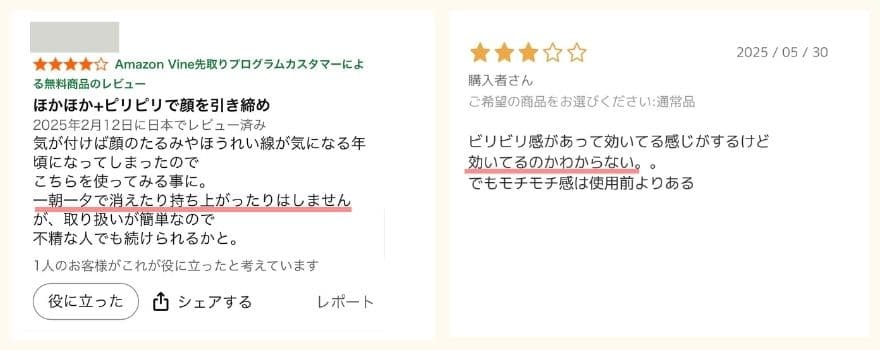 1〜2回で劇的変化を求めると物足りなく感じます。