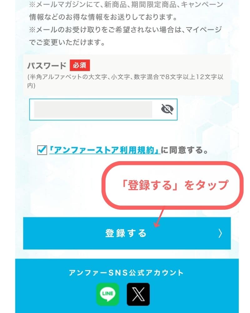 「アンファーストア利用規約に同意する」にチェックし、「登録する」をタップ。