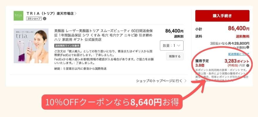 例えば、楽天SPUが3.8倍の私がトリアレーザー美顔器を購入する場合、獲得予定ポイントは3,283ポイントでした。